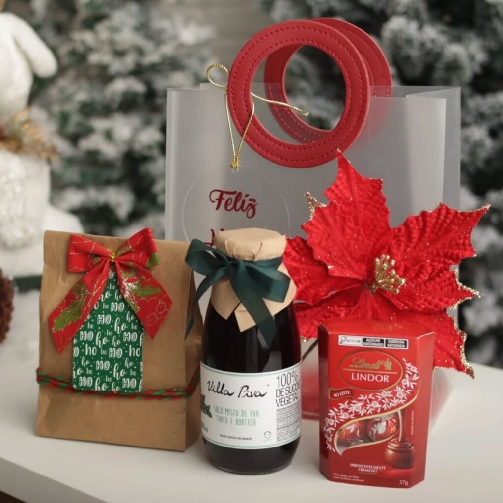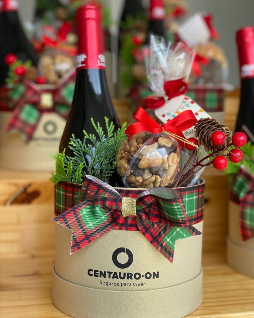 Incluye mini vino o espumoso, galletas navideñas, bastón de caramelo y cajita de chocolates decorada.