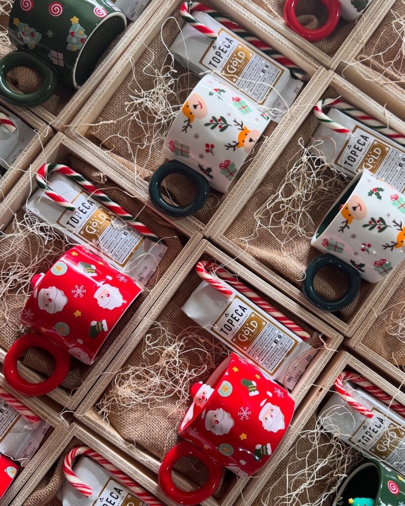 Cesta decorada con taza, chocolate, bastón de caramelo, decoración y tarjeta personalizada.