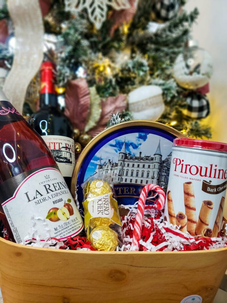 Canasta con Dewar’s, vino tinto Loma Negra, galletas danesas, aceitunas, turrón, dulces navideños y wafer rolls.