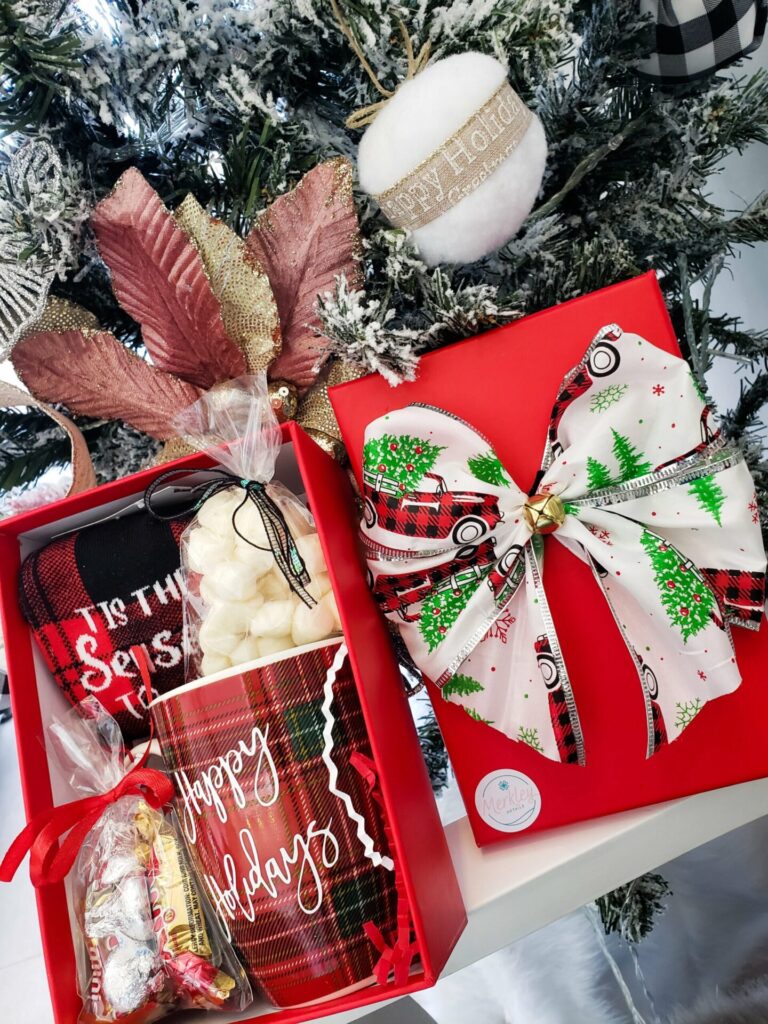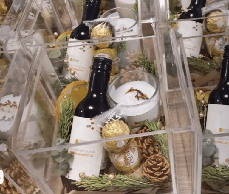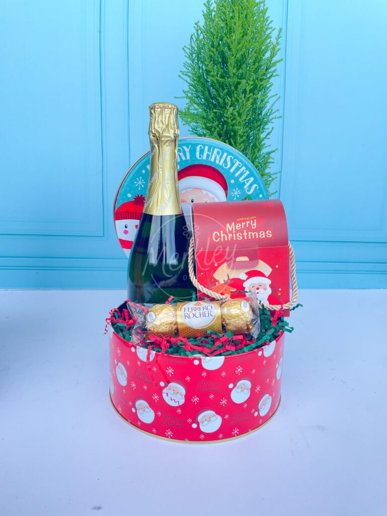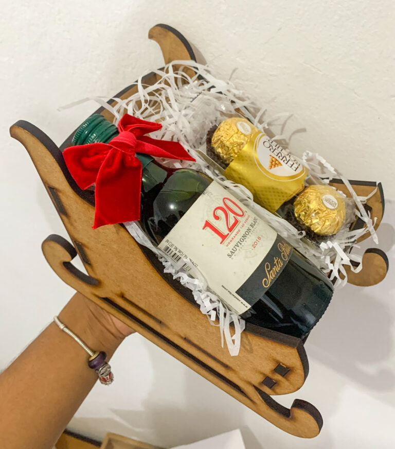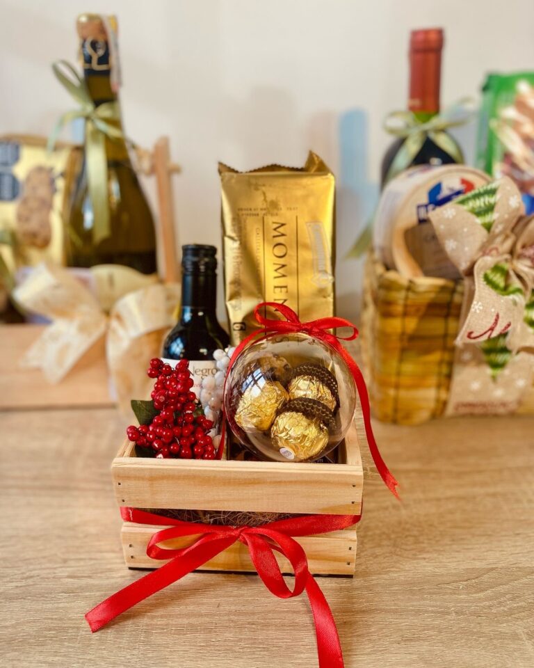 Baúl con espumoso o sidra, vino tinto Loma Negra, Dewar’s, panettone, wafer rolls, marshmallows y galletas...