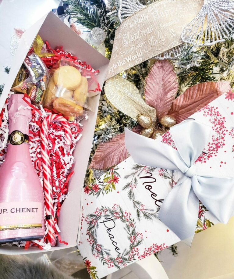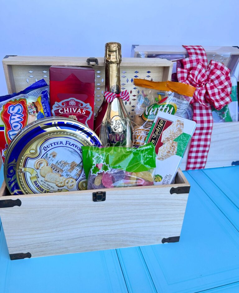 Baúl con JP Chenet dorado, dulces variados, galletas danesas, marshmallows, Chivas 12 años, turrón y coquitos.