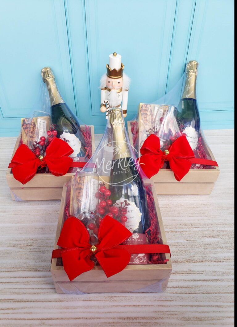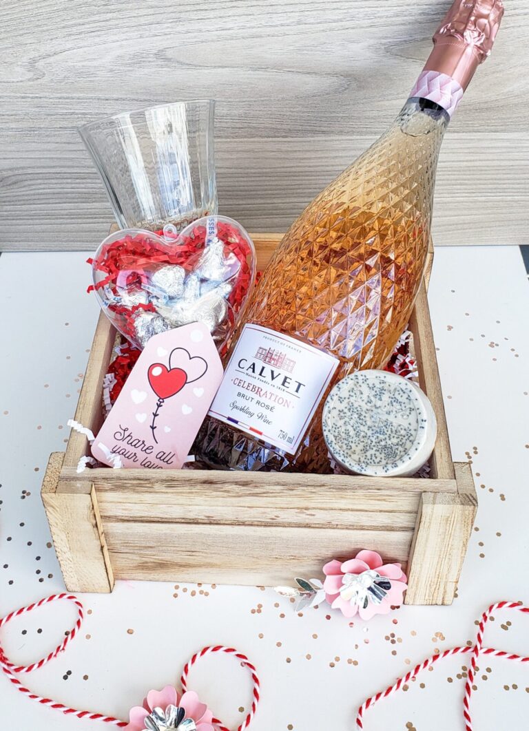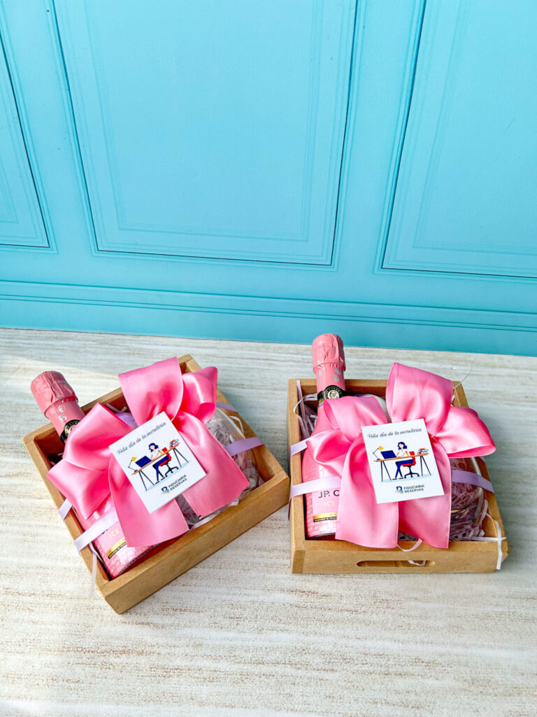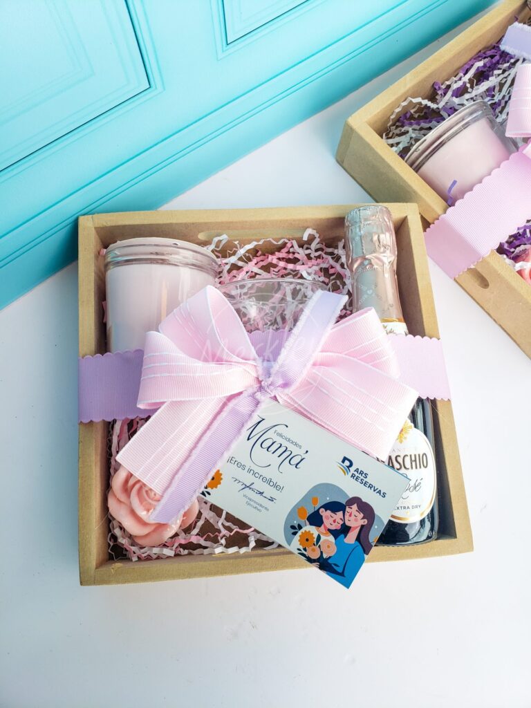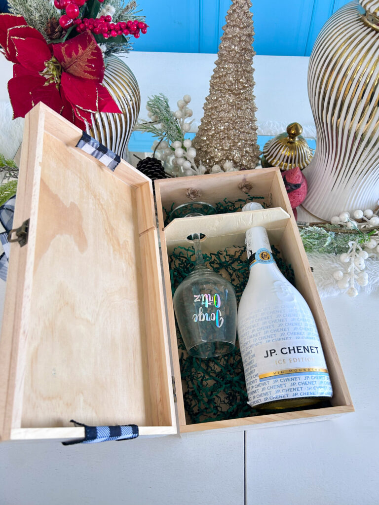 Caja vinera con copa y espumoso, presentada con detalles decorativos.