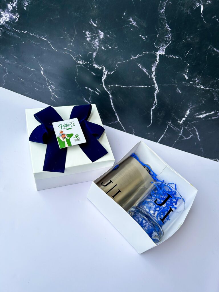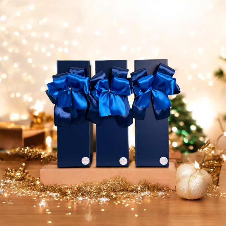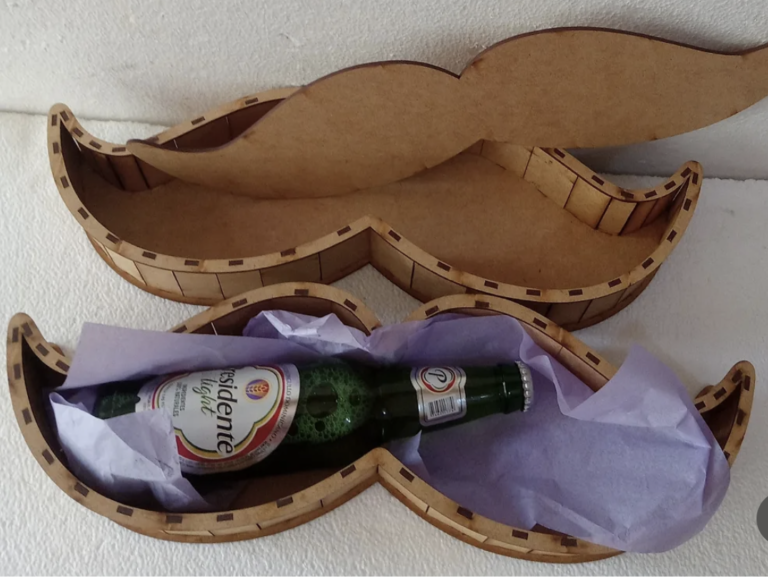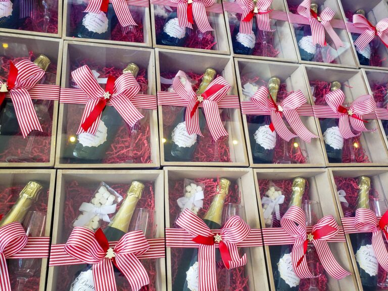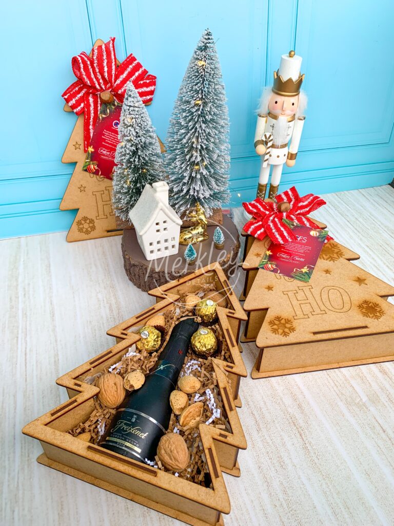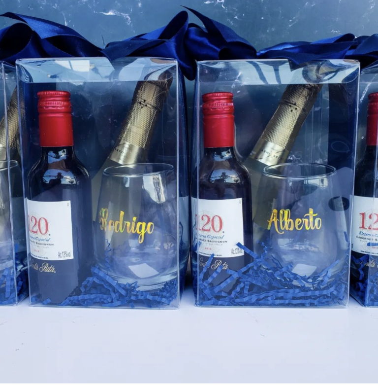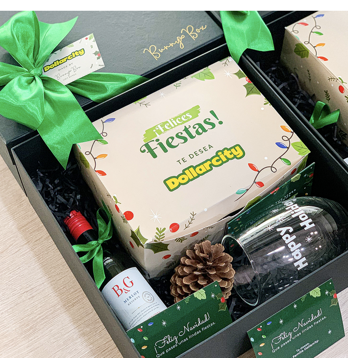 Caja vinera con copa y espumoso, presentada con detalles decorativos.