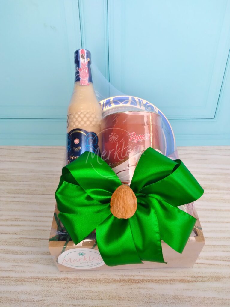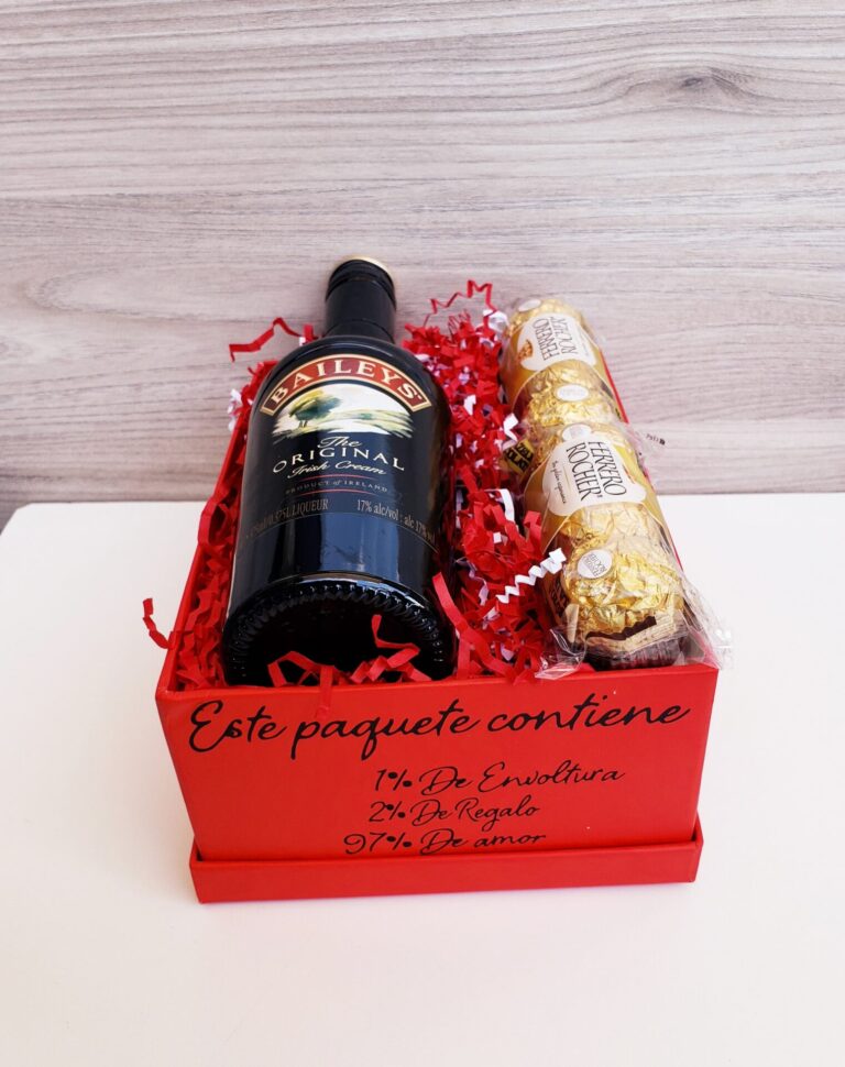 Baúl con frutos secos, marshmallows, aceitunas rellenas, pirulín, turrón, conserva de frutas, bombones, Baileys, vino tinto...