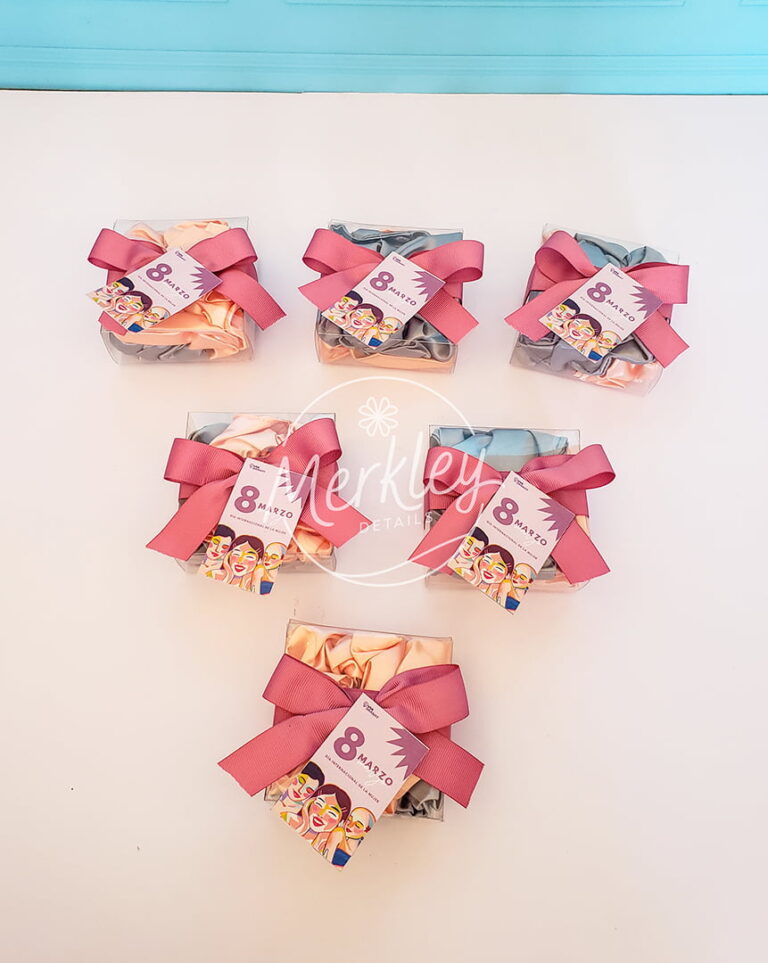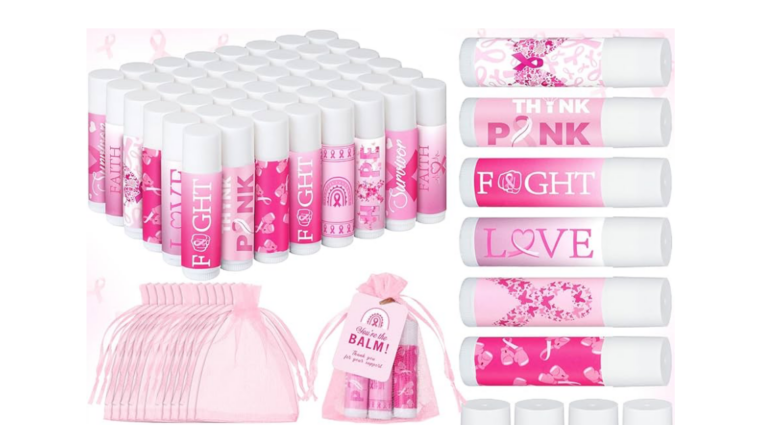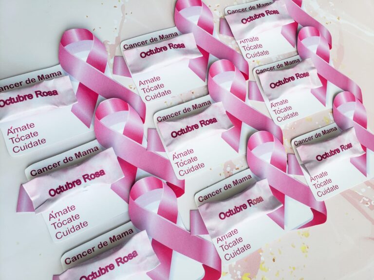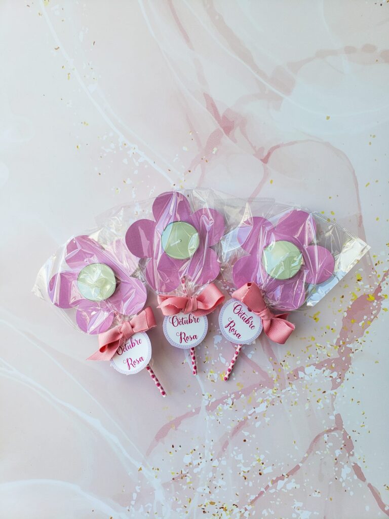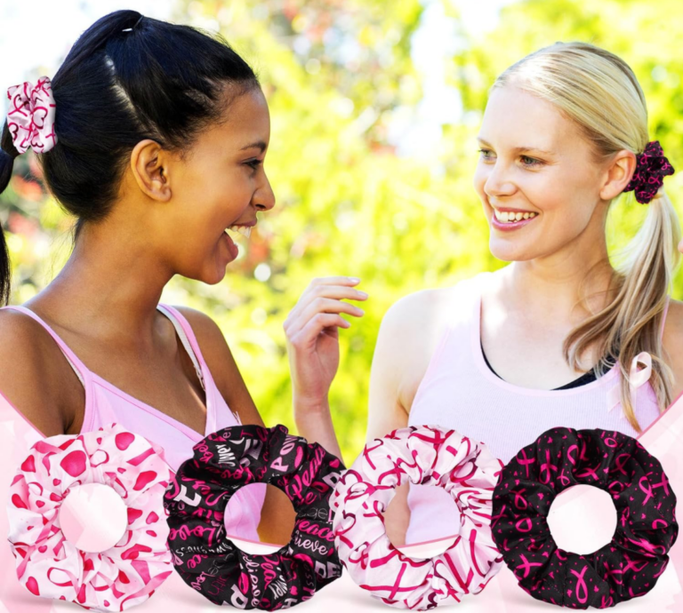 Scrunchie decorado en base de cartón con diseños del cáncer de mama.