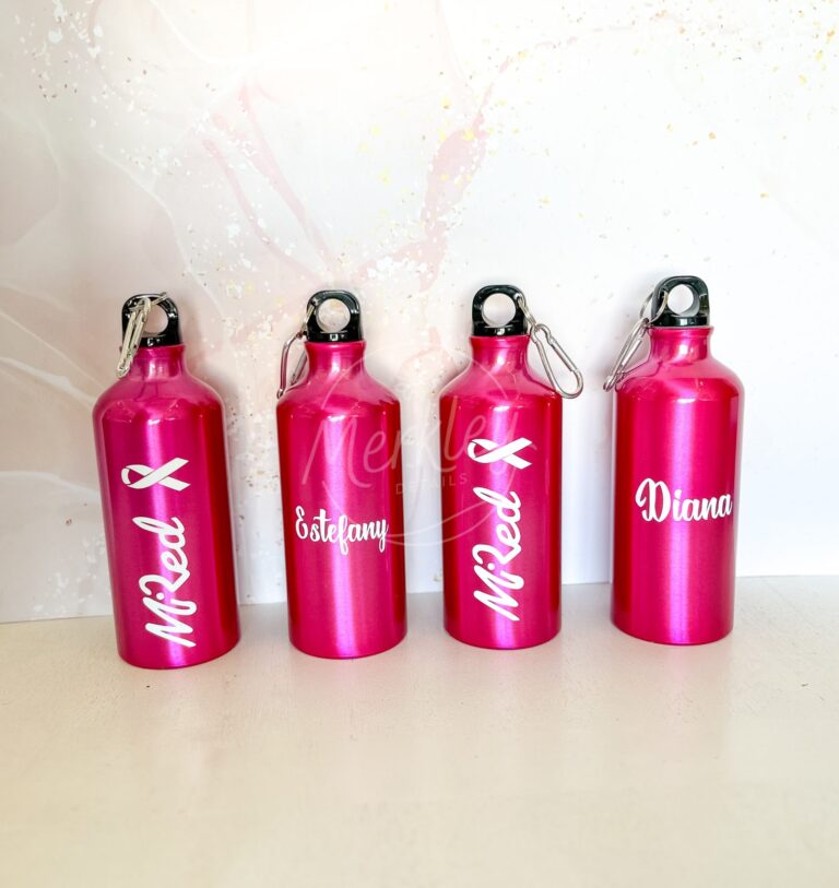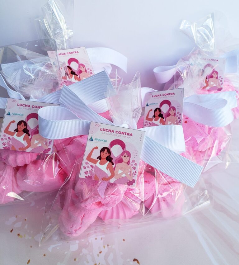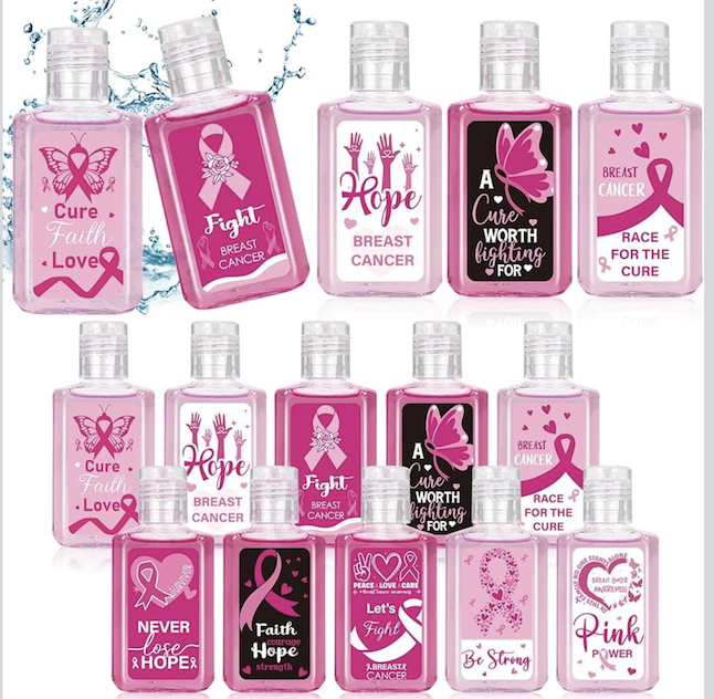 Gel antibacterial, tamaño cartera, personalizado con la temática de la prevención del cáncer de mama.