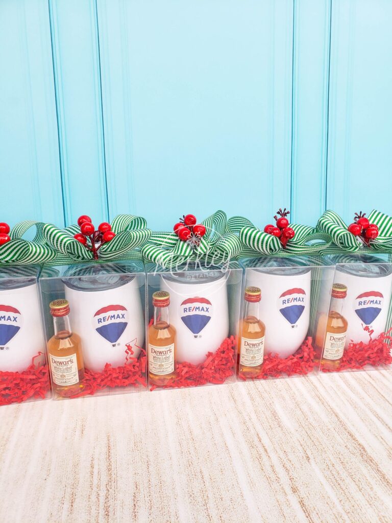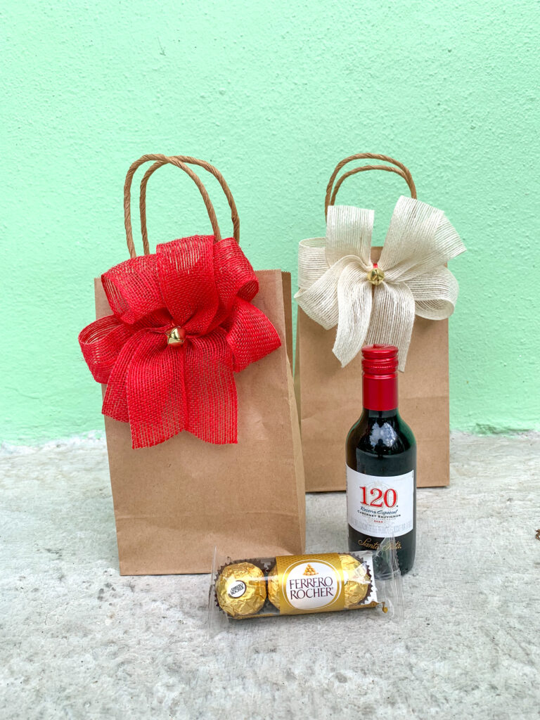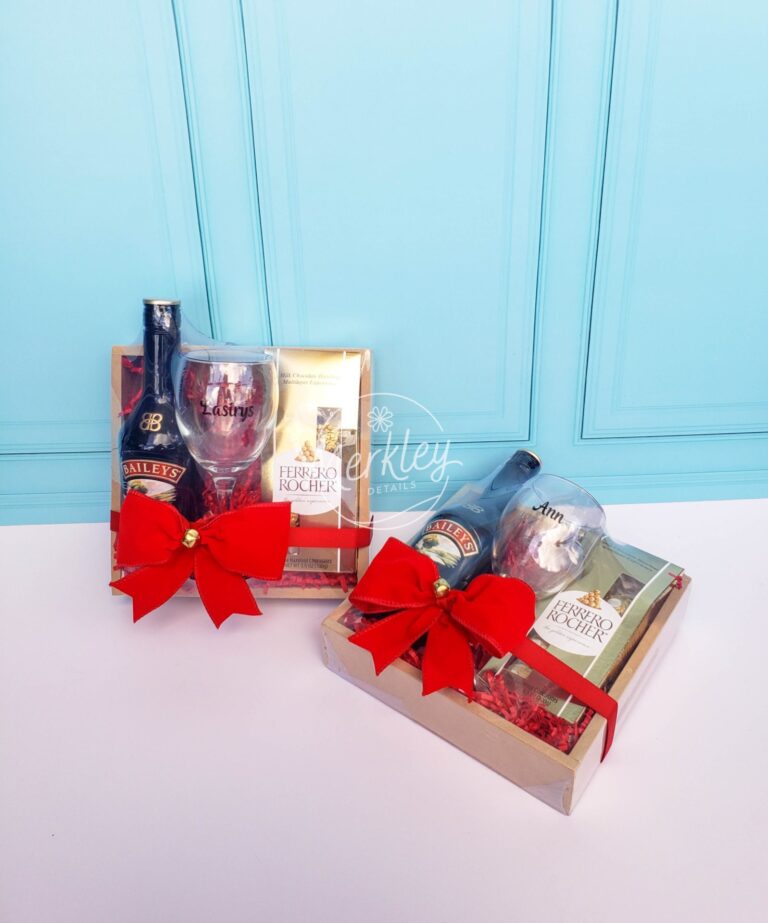 Mini canasta con vino y copa decorada, ideal como regalo elegante.