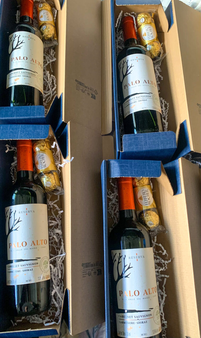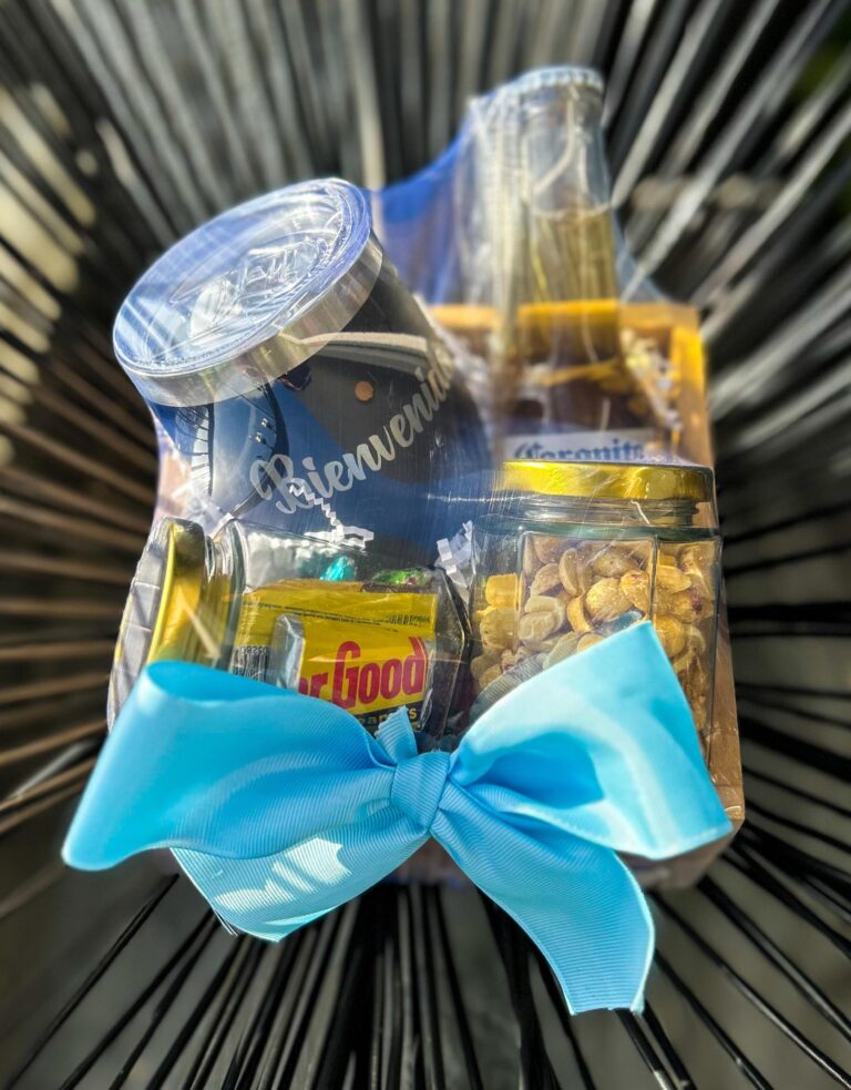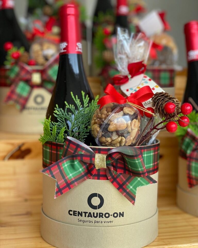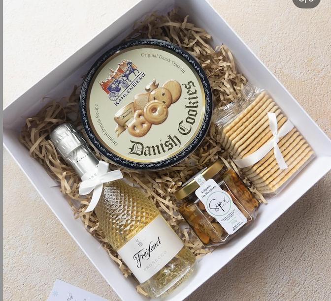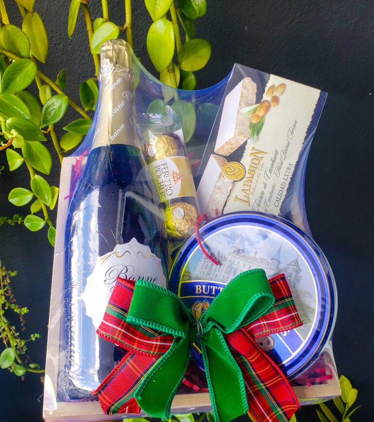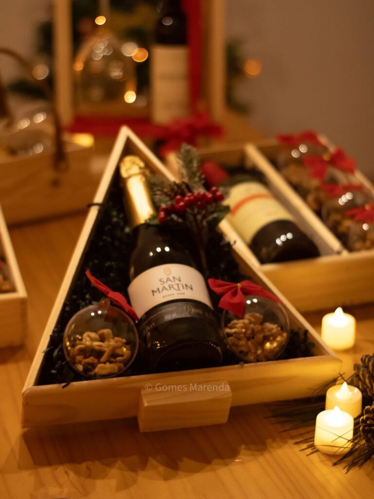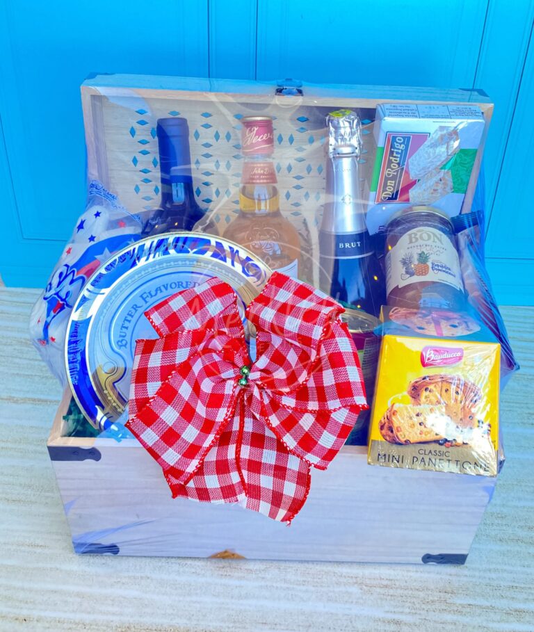 Baúl con Dewar’s, vino tinto, espumoso, conserva de frutas, galletas danesas, panettone, turrón y marshmallows.