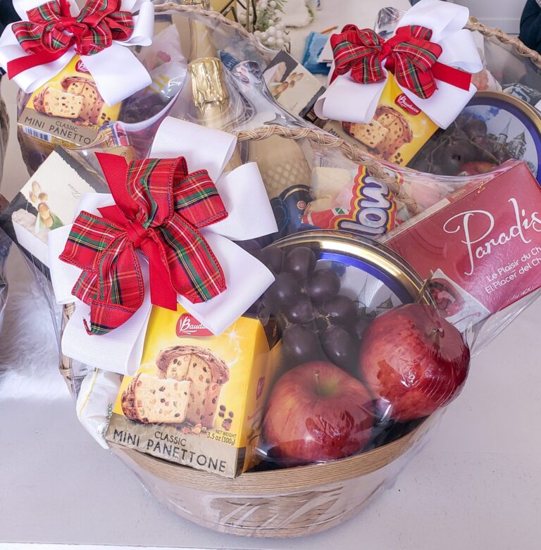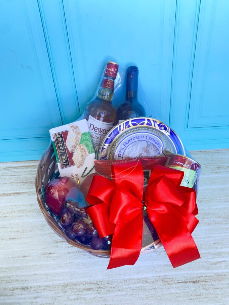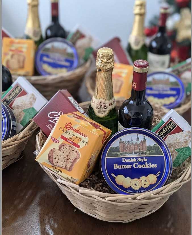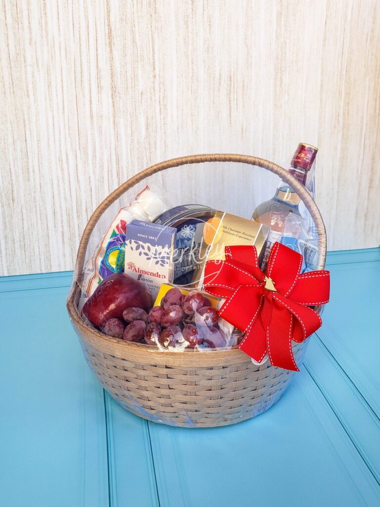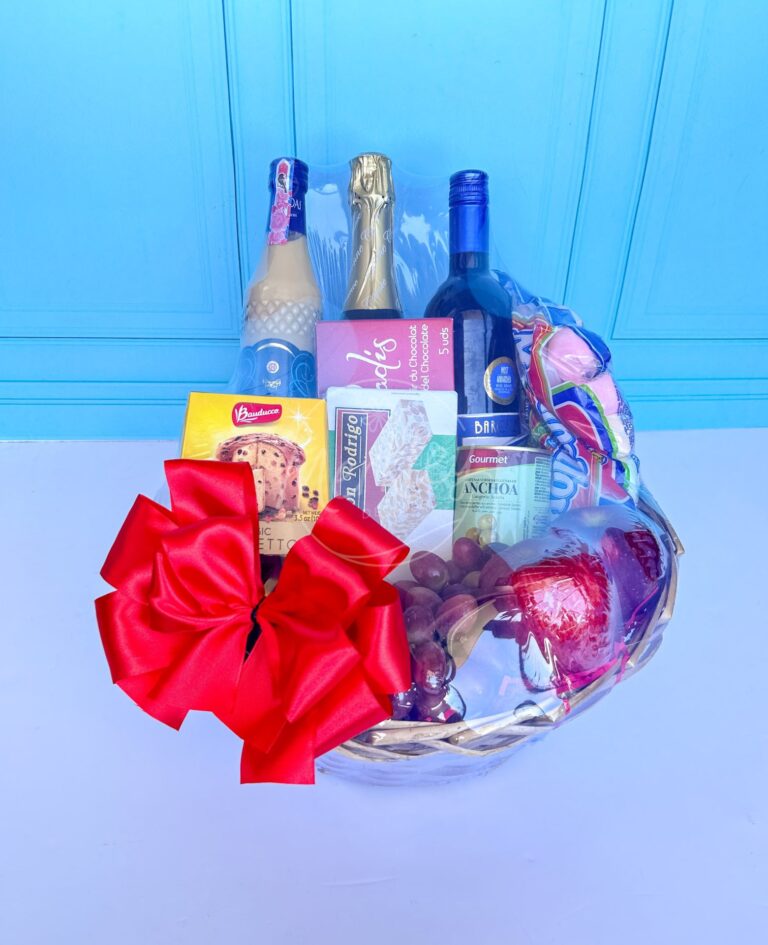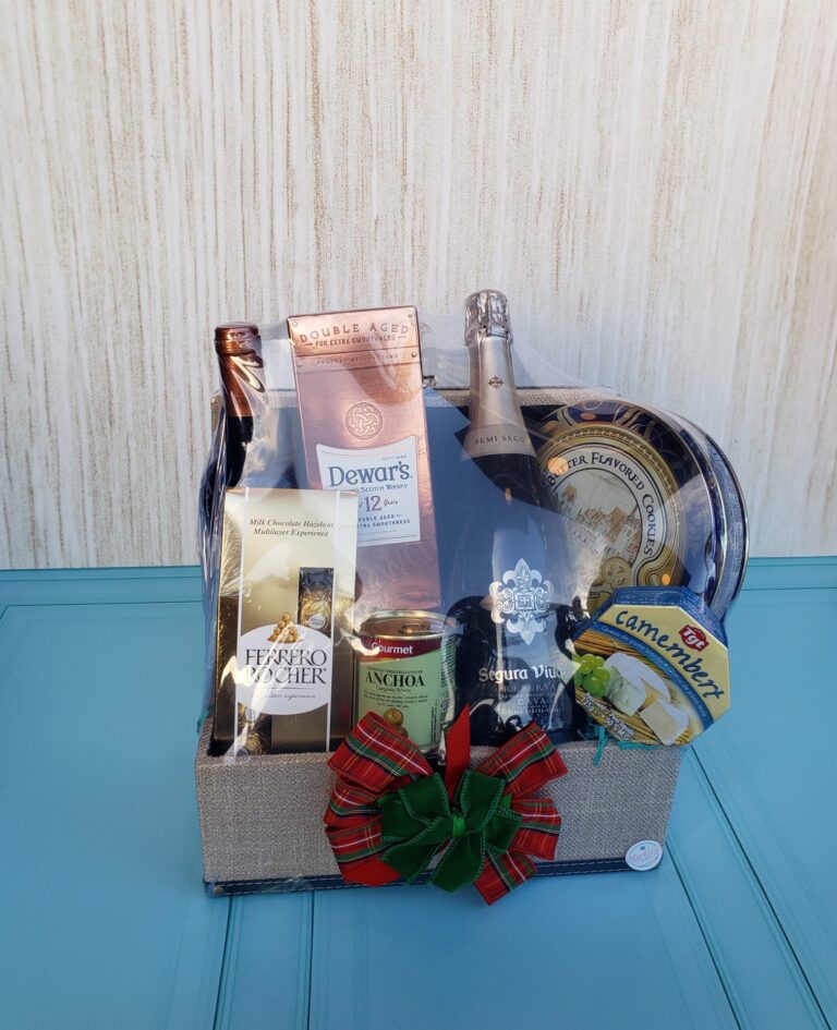 Canasta con Dewar’s, vino Loma Negra, manzanas, uvas, turrón, galletas danesas y aceitunas rellenas.