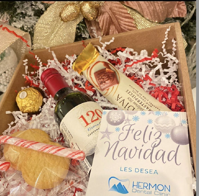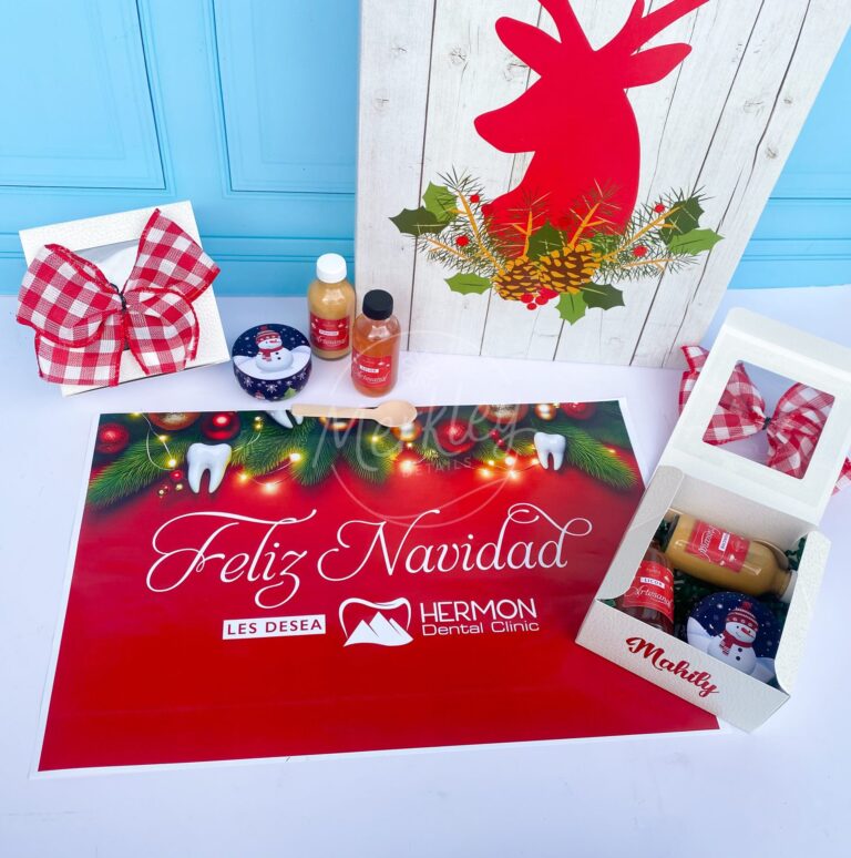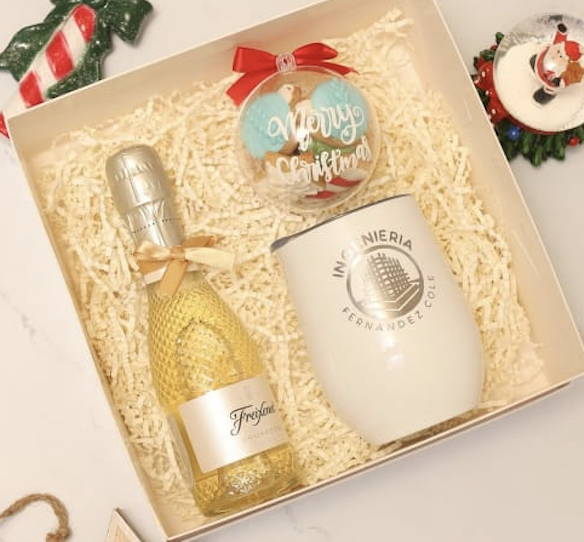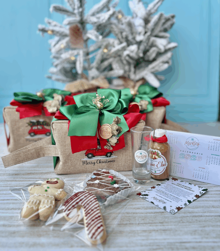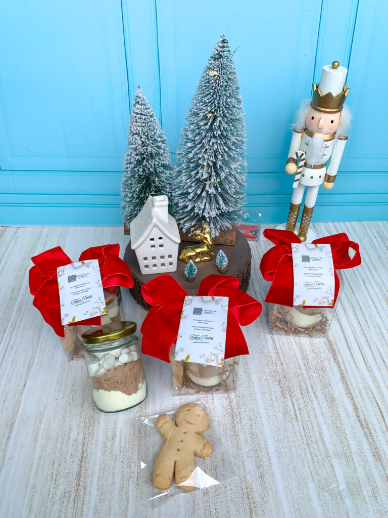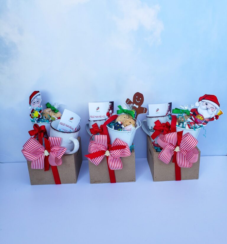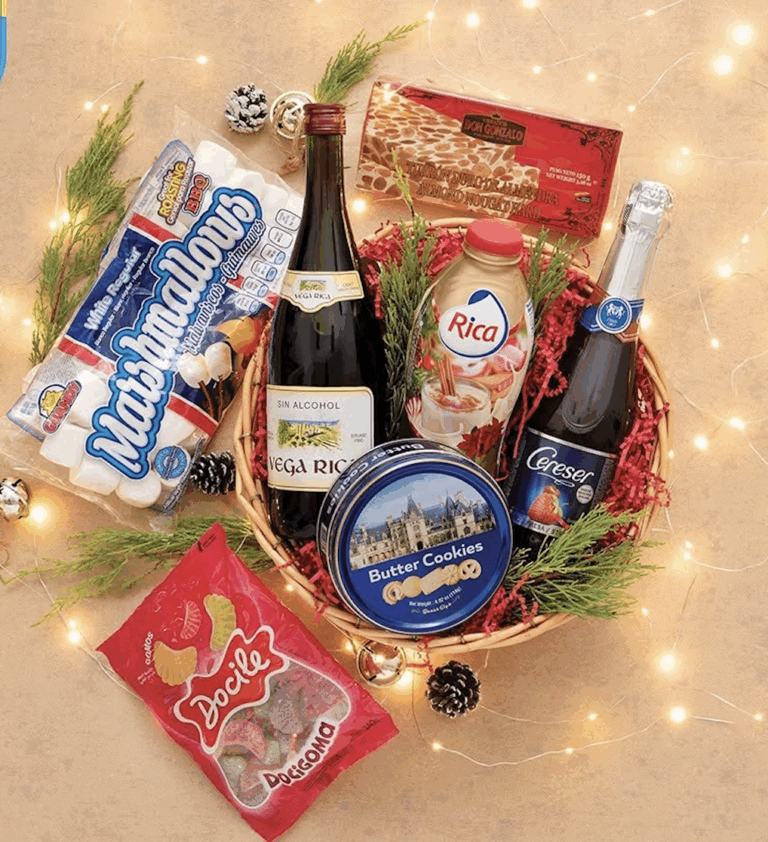 Incluye sidra sin alcohol, mini galleta danesa, marshmallows, gomitas navideñas, turrón y manzana.