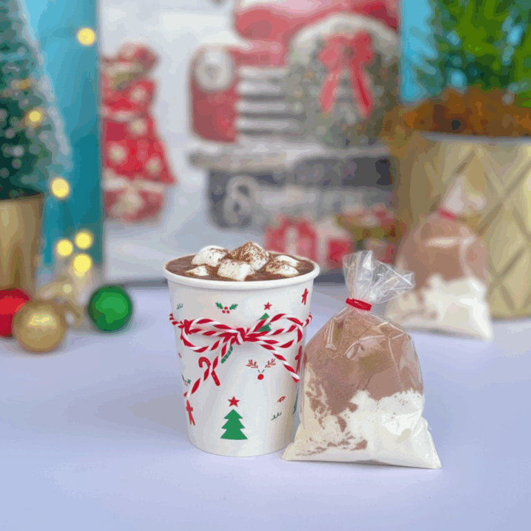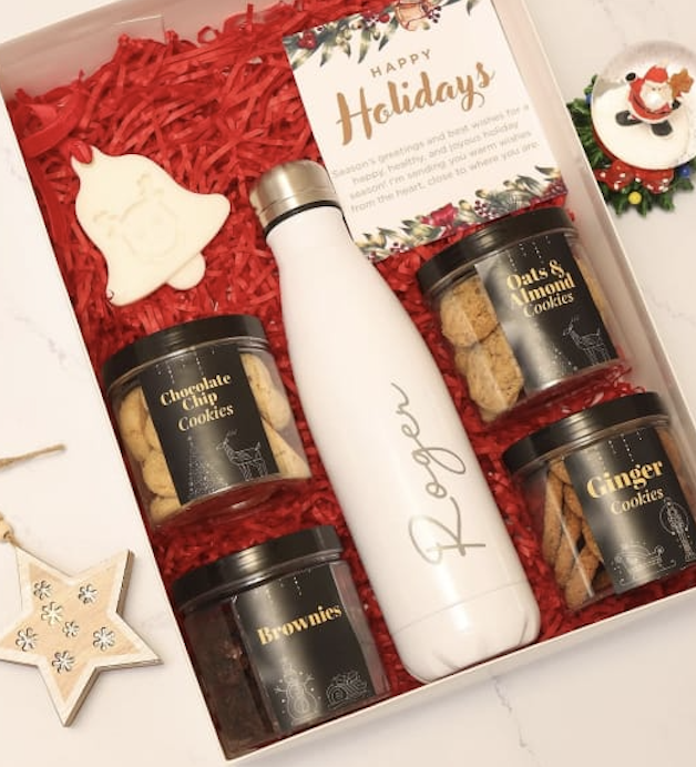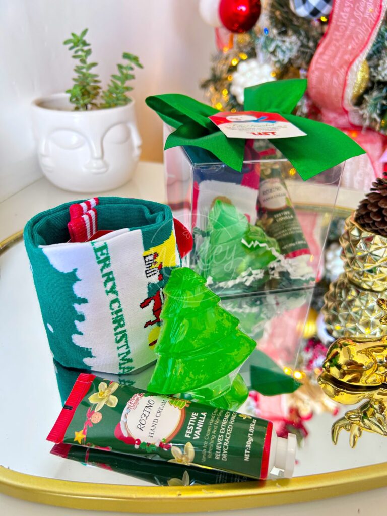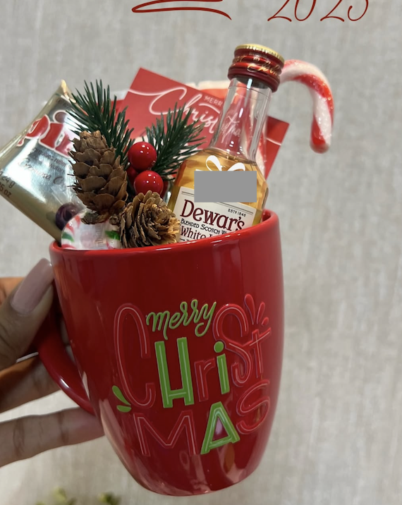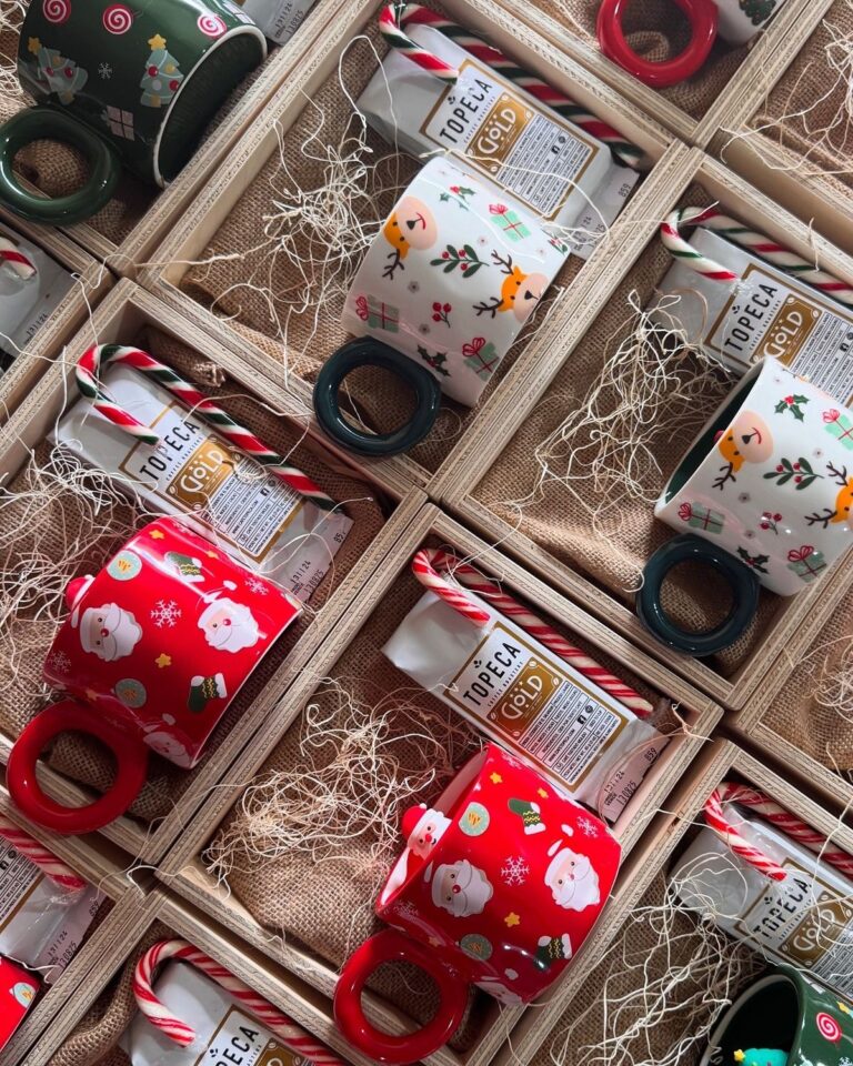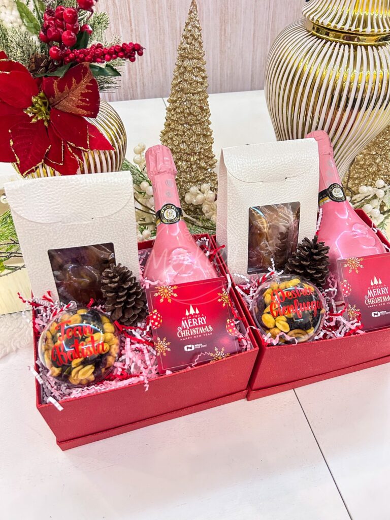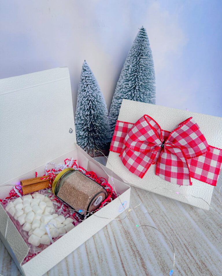 Incluye sidra sin alcohol, mini galleta danesa, marshmallows, gomitas navideñas, turrón y manzana.