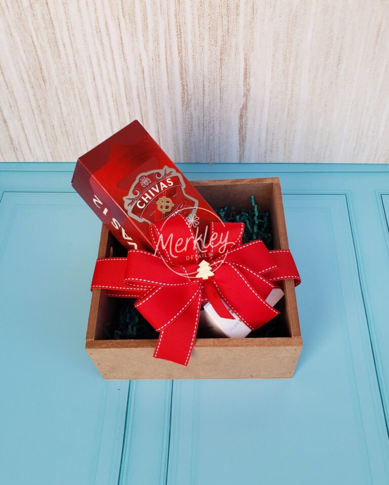 Whisky Chivas Regal presentado en cesta de madera decorada con detalles elegantes y productos complementarios.