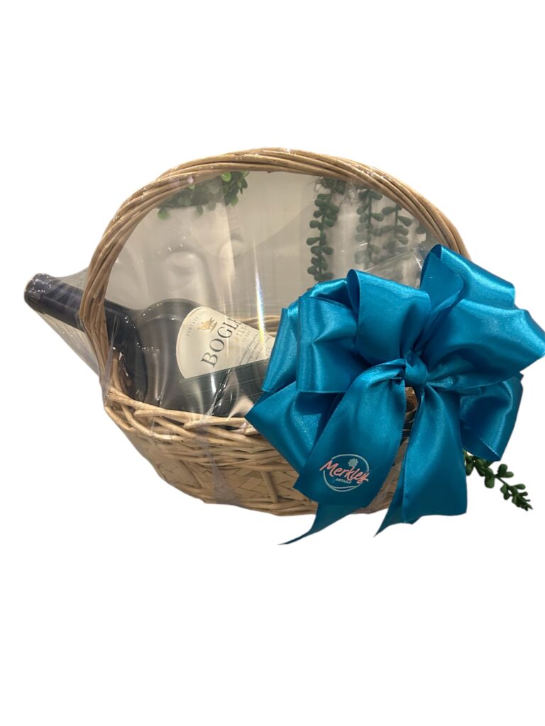 Cesta de madera con sidra o espumoso, vino tinto Loma Negra, galletas danesas, wafer rolls, bombones...