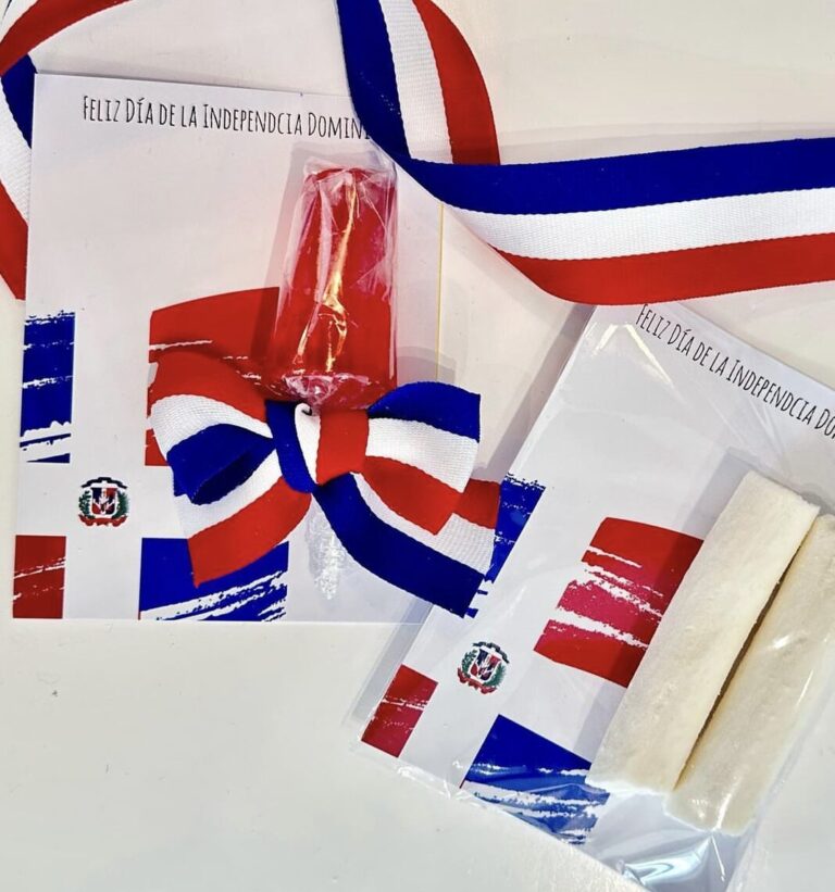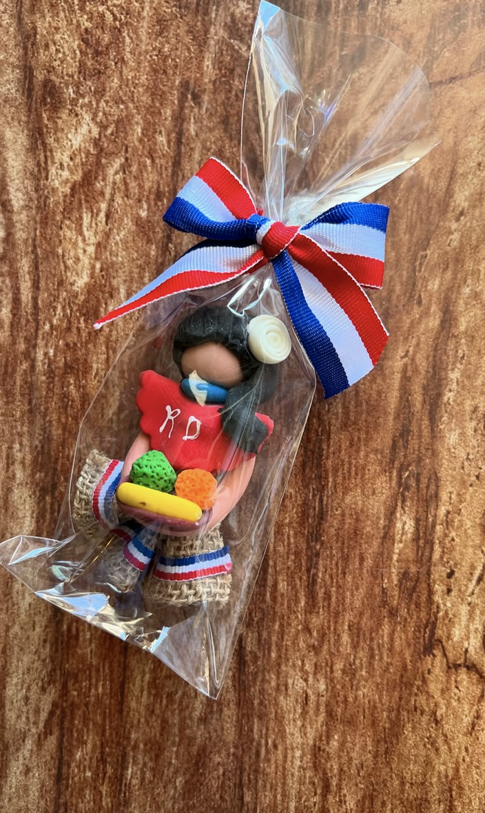 Bolsita con pilón y arrocito decorada con lazo tricolor.