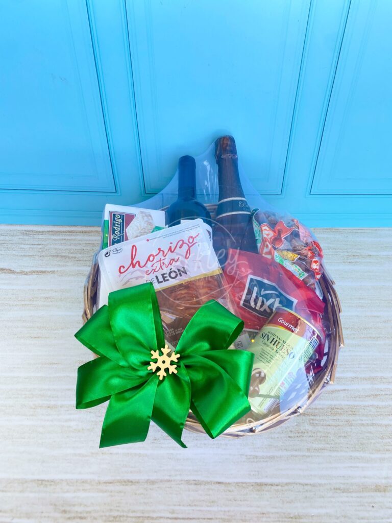 Canasta con sidra, vino, panettone, turrón y bombón cherry decorado, empacado al vacío.