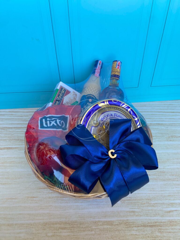Baúl con Dewar’s, vino tinto Loma Negra, espumoso, conserva de frutas, galletas danesas, aceitunas, turrón y...