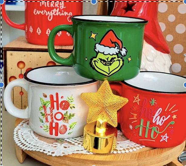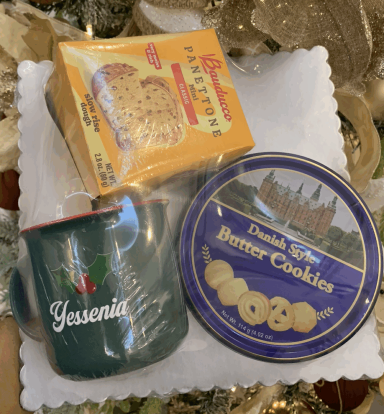 Panettone, galleta navideña mini y taza decorada en base sencilla con lazo y tarjeta.