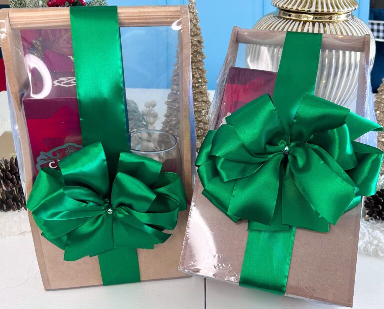 Mini canasta rellena de dulces surtidos con decoración festiva.