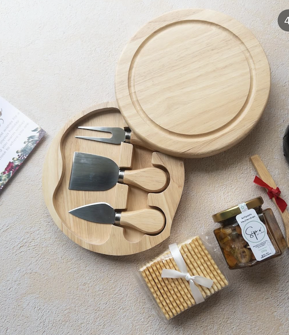 Vino Loma Negra, conserva de frutas, galletas y cesta de madera.